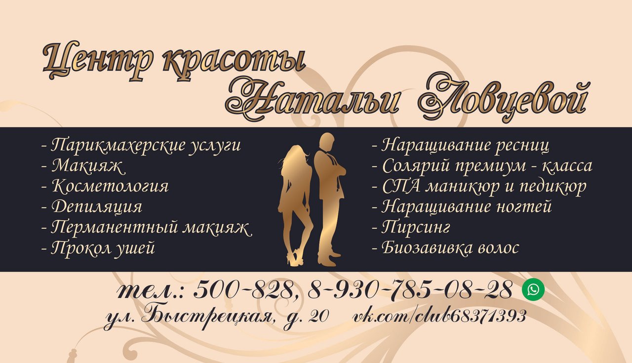 Ухоженный внешний вид, комплименты, уверенность в своей привлекательности - кто не желает этих прекрасных вещей? Все они доступны для вас с центром красоты Натальи Ловцевой! Наши парикмахеры, косметологи, визажисты и мастера по маникюру - волшебники, которые помогут вам преобразиться внешне и внутренне.